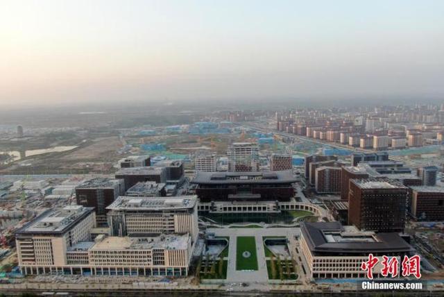 站在雄安商務服務中心廣場向北望去,視線掠過白色的大理石地面,經過中央巨大的石質日晷“時間之眼”,便看…