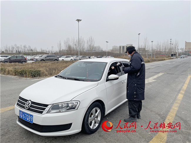 “給您測一下體溫,請出示健康碼!1月25日,雄安飄起雪,90后小伙常忠祥一手拿著二維碼、一手拿著體溫槍,攔下每輛進入雄安市民服務中心P1停車場的車輛。