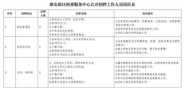 7.崗位所需要的其他條件(詳見附件《雄安新區殯葬服務中心公開招聘工作人員崗位表》)。