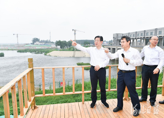 7月16日,省委書記、省人大常委會主任王東峰在雄安新區調研檢查。省委副書記、省長許勤參加調研檢查。這是王東峰、許勤在雄安新區新蓋房樞紐改擴建工程建設現場,詳細了解防汛重點工程運行情況。河北日報記者趙威攝