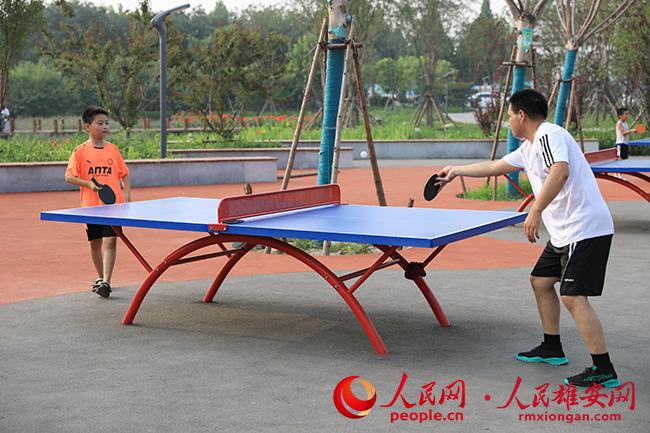 張海永的兒子即將升入五年級,為了讓孩子遠離電子產品,暑假期間他每天下午都堅持帶孩子出來打乒乓球,幾個回合下來兩人大汗淋漓,但也暢快無比!拔壹译x白洋淀站站前公園很近,走幾步就到了,一起運動,不僅增強了體質,也讓我們父子間更親密、讓孩子更開朗了!睆埡S栏吲d道。