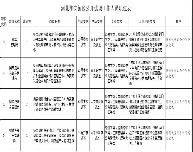 附:河北雄安新區公開選調工作人員職位表