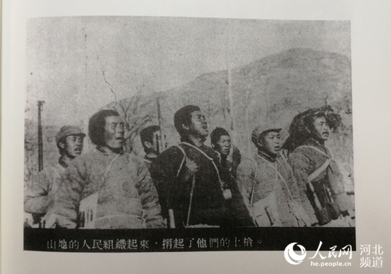 在圖冊中,不光有狼牙山跳崖戰士、子弟兵戰斗英雄鄧世軍、民兵爆炸英雄李勇、手槍隊長魏占英、武裝工作隊長王樹平這些戰斗英雄,還有婦女們組織了起來在練習投彈,山區的老百姓扛起了獵槍,土槍、洋炮、滾木檑石,各種武器;麻雀戰、地雷戰、地道戰,各種奇謀妙計……。燕趙大地,真是遍地英雄。