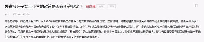 孩子入學問題解決后,網友“雄安新人”再次通過“領導留言板”表達了感謝之情:“尊敬的領導,非常感謝各級(部門)對我們之前反饋的外省隨遷子女上學的問題給予解決!彼f,“在留言板咨詢問題后,縣教育局和所屬片區學校第一時間聯系了我們,給我們逐條解釋清楚了今年的招生政策,以及針對我們這種外省戶口在本地穩定居住的家庭子女入學問題會切入實際的給予解決,不會讓片區內的孩子無學可上的。對于教育局和學校的答復表示滿意,感謝各級部門和學校為民考慮的工作態度和工作做法!