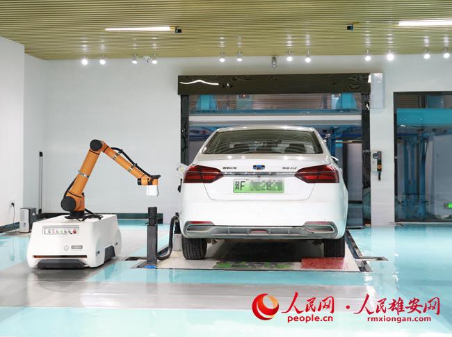 在劇村智慧能源融合站內的智慧充電站,智能機器人為汽車充電。人民網 劉師豪攝