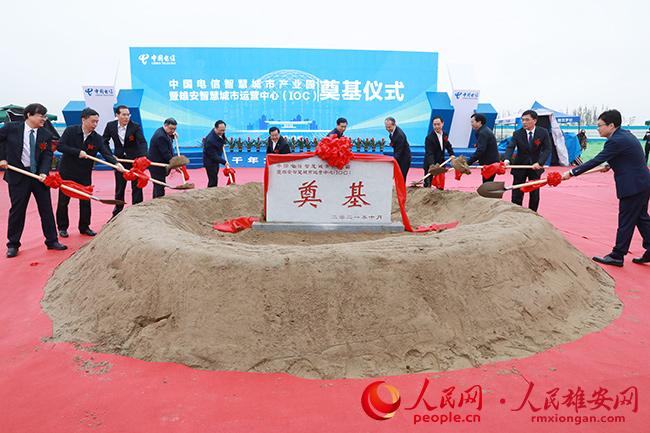 圖為與會領導為中國電信智慧城市產業園暨雄安智慧城市運營中心進行奠基。人民網 王紅攝