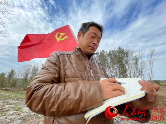 館陶縣王橋鄉徐萬倉村黨支部書記徐俊峰在記錄巡堤記錄。 周紹宗攝