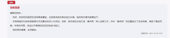 對于劉艷素的心愿,安新縣委很快回復了,稱縣領導已責成相關單位進行處理,相關單位也已將打造“唐詩街”納入近期工作,并對“唐詩街”的位置進行了實地考察,確定了建設范圍、布局及風格,待設計方案確定后將立即進行施工。