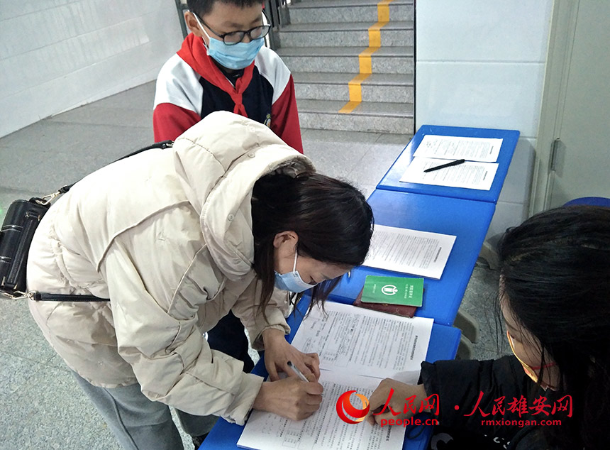 雄安新區安新縣第一小學的學生家長正在簽署知情同意書。安新縣教育局供圖
