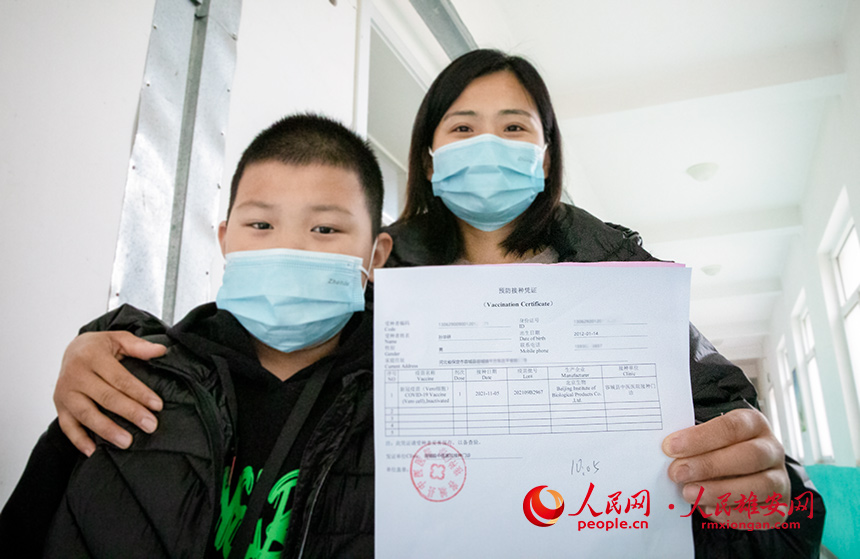雄安新區容城縣午方北莊小學學生孫華研在母親的陪同下完成了疫苗接種。人民網 宋燁文攝
