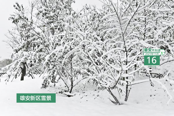 今天是2021年11月16日,星期二,天氣晴轉多云,1℃~16℃。在封面和大家見面的是雪中的雄安新區。