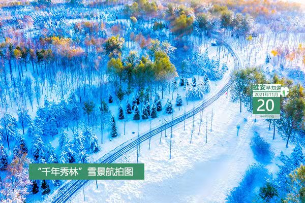 今天是2021年11月20日,星期六,天氣陰轉小雨,0℃~10℃。在封面和大家見面的是“千年秀林”雪景航拍圖。