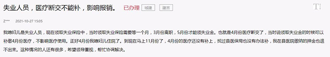 記者聯系當事人了解到,該網友的妻子今年3月份從公司離職,5月份開始領取失業保險金,因各種原因,4月份醫保產生斷繳且遲遲補繳不了。期間其妻生病住院,發現相關費用不能報銷,“我們一家都急壞了”。該網友告訴記者。