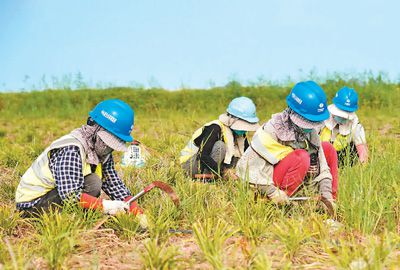 工人在雄安新區藻苲淀退耕還淀濕地恢復工程項目區內清理雜草。