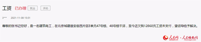 人民網雄安12月2日電 (王紅)“領導您好,我是一名建筑電工,在北京城建雄安容西片區E單元47號樓、48號樓干活,(工期結束后)至今還欠我12860元工資未支付,望領導給予解決!