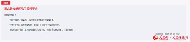 雄安新區黨工委管委會在收到留言后,責成相關部門進行調查處理,并回復網友稱“工資已經發放到位!庇浾呗撓盗粞缘木W友了解到,他和30多名工友被拖欠的80余萬元工資已經拿到手了。