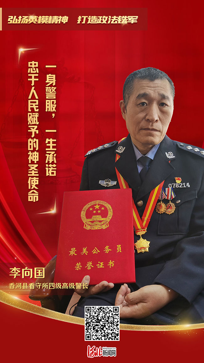 12月2日,中央組織部、中央宣傳部聯合發布“最美公務員”先進事跡,香河縣看守所四級高級警長李向國成為我省唯一獲此殊榮的人。