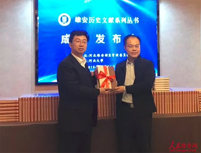 圖為2018年11月21日,河北大學向雄安新區贈送了《雄安歷史文獻系列叢書》。施云娟攝