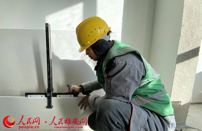 趙孟儒正在切割石膏吊頂板。人民網 劉師豪攝