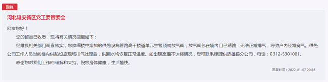雄安新區黨工委、管委會收到留言后,責成雄縣相關部門進行核實。經核查,發現是孫先生家閣樓中增加的供熱設施管路高于樓道單元主管頂端放氣閥,放氣閥包在墻內且已銹蝕,無法正常排氣,導致戶內經常窩氣。找到問題后,雄縣供熱公司工作人員立即對閣樓內供熱設施現場排氣問題進行了處理,目前供回水均已恢復正常溫度。