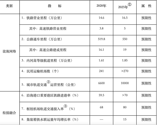 注:①〔〕內為5年累計數。②指納入國家批準的城市軌道交通建設規劃中的大中運量城市軌道交通項目。③指國際樞紐機場和區域樞紐機場中連通軌道交通的機場數量占比。④指重點營運車輛、郵政快遞自有干線運輸車輛、應安裝具備衛星定位功能船載設備的客船及危險品船等。⑤指新能源公交車輛占所有地面公交車輛的比重。⑥指按單位運輸周轉量計算的二氧化碳排放。