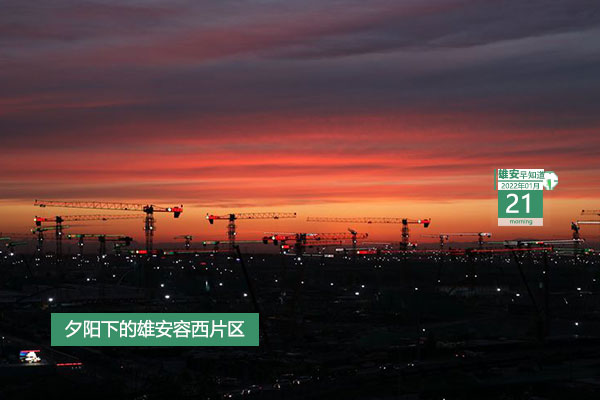 今天是2022年1月21日,星期五,天氣小雪,-6℃~0℃。在封面和大家見面的是夕陽下的雄安容西片區。