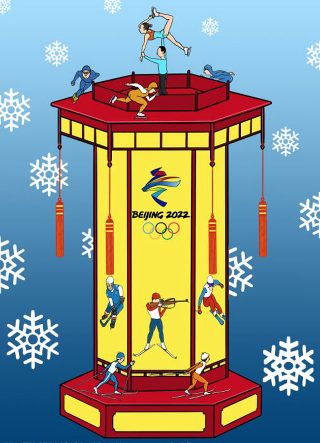 宮燈是富有中國特色的傳統手工藝品之一,畫屏圖案內容多為龍鳳呈祥、福壽延年、吉祥如意等,有著美好的祝福寓意。漫畫家孫德民的作品《新春瑞雪迎冬奧》,讓冬奧運動員現身古老的宮燈之上,全方位展示冬奧的魅力。