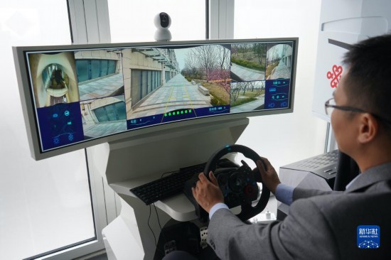 在雄安數字交通實驗室,負責人任大凱對無人駕駛汽車進行遠程操控(2021年3月26日攝)。新華社記者 金皓原 攝