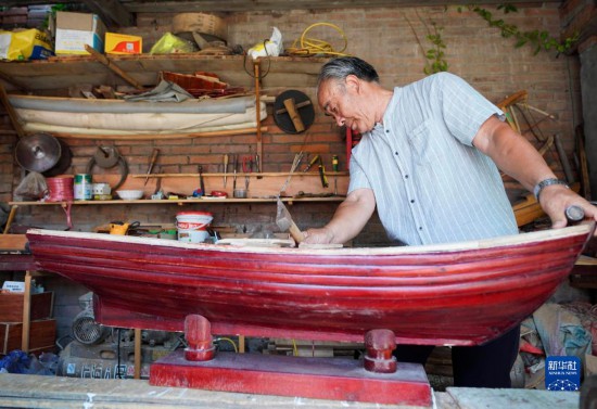 河北雄安新區安新縣馬家寨村人劉廣玉在制作木船模型(2019年7月25日攝)。新華社記者 邢廣利 攝