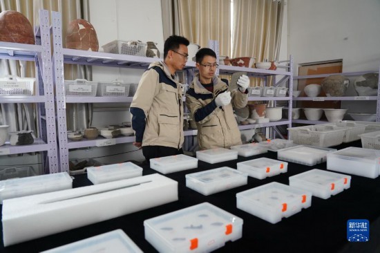 考古隊員在研究河北雄安新區南陽遺址的出土器物(2021年3月19日攝)。新華社記者 牟宇 攝