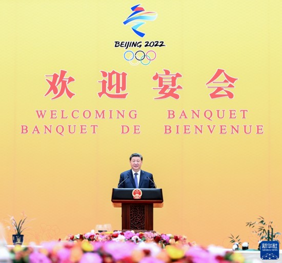 2月5日中午,國家主席習近平和夫人彭麗媛在北京人民大會堂金色大廳舉行宴會,歡迎出席北京2022年冬奧會開幕式的國際貴賓。這是習近平在宴會上發表致辭。新華社記者 翟健嵐 攝