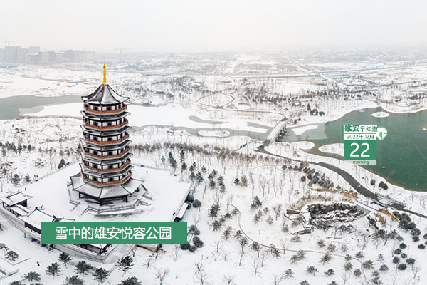 今天是2022年2月22日,星期二,晴,-9℃~4℃。在封面和大家見面的是雪中的雄安悅容公園。