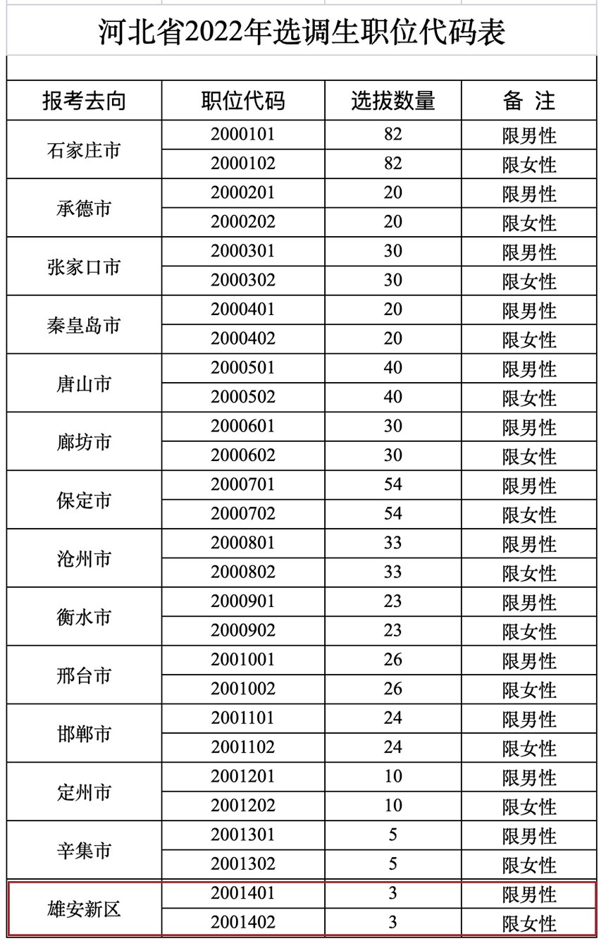 人民網雄安2月23日電 (宋燁文)河北正面向普通高校應屆畢業生和服務基層項目工作經歷人員選拔選調生。2022年全省計劃選拔選調生共800名。其中,雄安新區6名,男女各占50%。