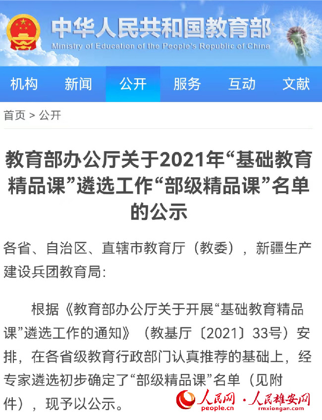圖為教育部網站公示。雄縣教育局供圖