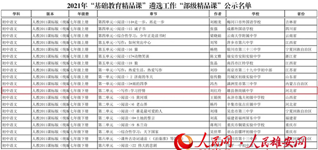 人民網雄安2月23日電 (李雪晴)教育部辦公廳公布2021年“基礎教育精品課”遴選工作“部級精品課”獲獎名單,雄安新區雄縣教師劉紅玲的參評課例《學習抒情》在列。據了解,這也是雄安新區唯一的獲獎課例。