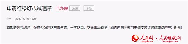 人民網雄安2月24日電 (李雪晴)“張崗鄉張開路與青年路,十字路口,交通事故頻發,能否向有關部門申請安裝紅綠燈或減速帶?”近日,有網友在人民網“領導留言板”留言,反映雄安新區雄縣張崗鄉一路段存在安全隱患,導致交通事故頻發,希望能安裝交通信號燈或減速帶。