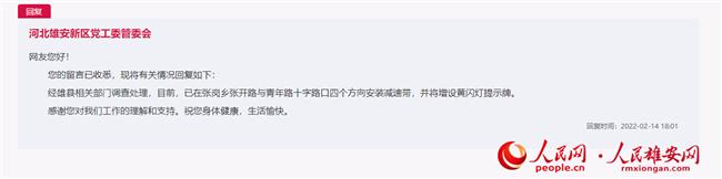 目前,張開路與青年路十字路口四個方向均已經安裝了減速帶,并將在月底放置黃閃燈和提示牌,以更好保障人民群眾的交通安全,有效預防和減少交通事故的發生。 同時,雄安新區黨工委管委會也在網上對該網友的留言進行了回復。