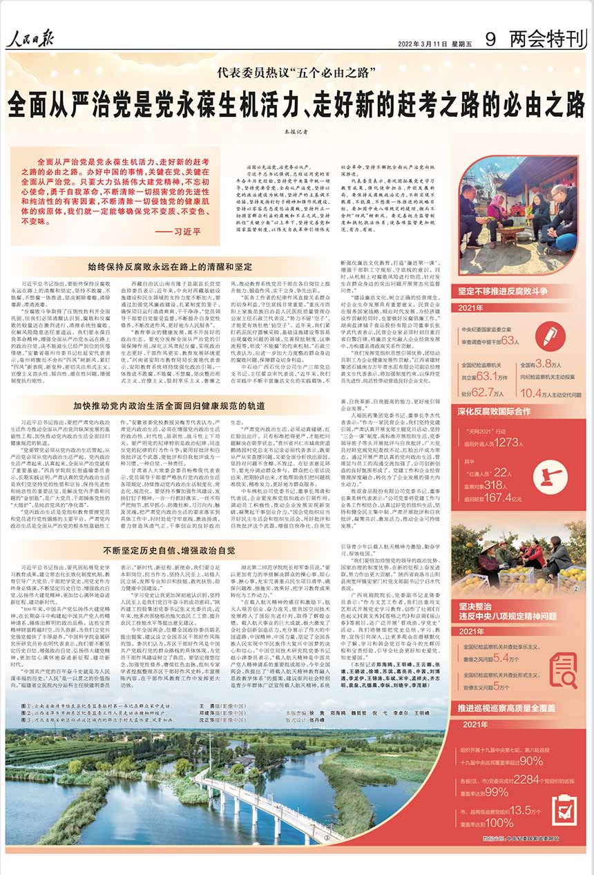 代表委員表示,要鞏固拓展黨史學習教育成果,強化使命擔當、開創發展新局。要保持反腐敗政治定力,不斷實現不敢腐、不能腐、不想腐一體推進的戰略目標。要加固中央八項規定的堤壩,鍥而不舍糾“四風”樹新風。要完善權力監督制度和執紀執法體系,使各項監督更加規范、有力、有效。