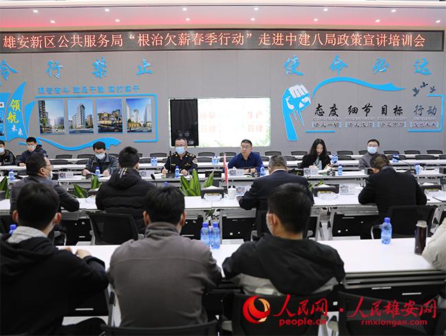 人民網雄安3月16日電 (王紅)為進一步抓緊抓實根治欠薪工作,雄安新區公共服務局3月16日在容東片區召開“根治欠薪春季行動”走進中建八局政策宣講培訓會,圍繞根治欠薪、農民工工傷保險繳納工作進行政策宣講。
