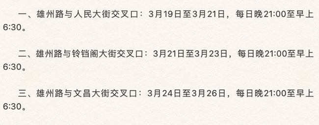 9、雄縣啟動實施雄州路南段弱電線網改造工程。施工期間道路需要斷交。具體斷交路段與斷交時間如下: