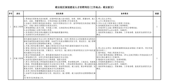 此次招聘崗位分別為1名副總工程師,1名市政工程師,1名土建工程師,1名建筑工程師,1名電氣工程師,1名給排水暖通工程師,1名信息化工程師(弱電工程師),1名造價工程師(土建),1名造價工程師(安裝),1名法務專員。有意者可于3月31日前將簡歷發送至郵箱bjfuxiongan@163.com。聯系電話為010-62338853,010-62338181。
