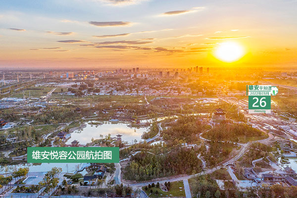 今天是2022年3月26日,星期六,天氣晴 ,0~19℃。在封面和大家見面的是雄安悅容公園航拍圖。