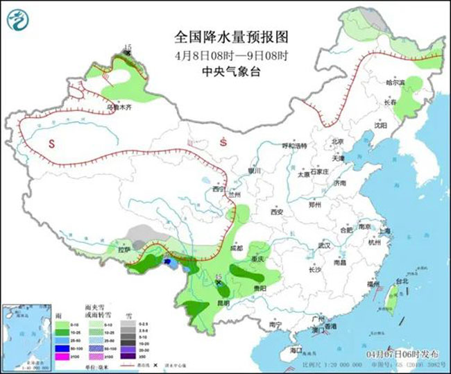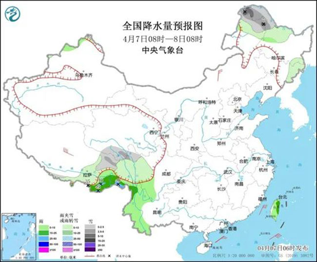 其中4月6日,新疆北疆北部、西藏東部、青海南部、川西高原西北部、內蒙古東北部、黑龍江西北部和東南部、吉林東部等地的部分地區有小到中雪或雨夾雪,其中內蒙古東北部、黑龍江西北部等地局地大雪(5~7毫米);西藏東南部、四川西南部、云南中西部及臺灣島等地的部分地區有小到中雨,其中西藏東南部等地局地大雨(25~45毫米)。
