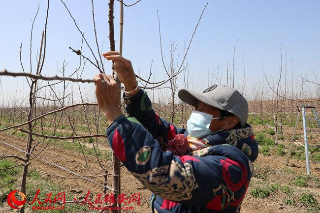 沙河村村民崔素英正在給紅西梅樹拉枝。劉師豪攝