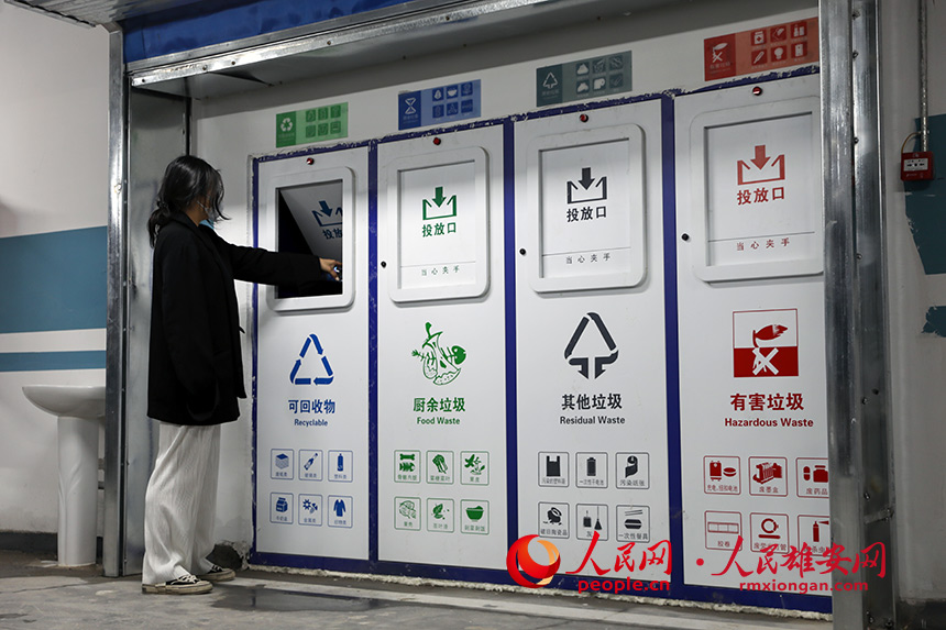 雄安新區將推進“無廢城市”建設,持續推進“存量處理全量化、建設過程無廢化、新區發展無廢化”建設,率先形成“無廢城市”建設綜合管理體系,發揮示范帶動效應。圖為容東片區的居民正在進行垃圾分類投放。陳世豪攝