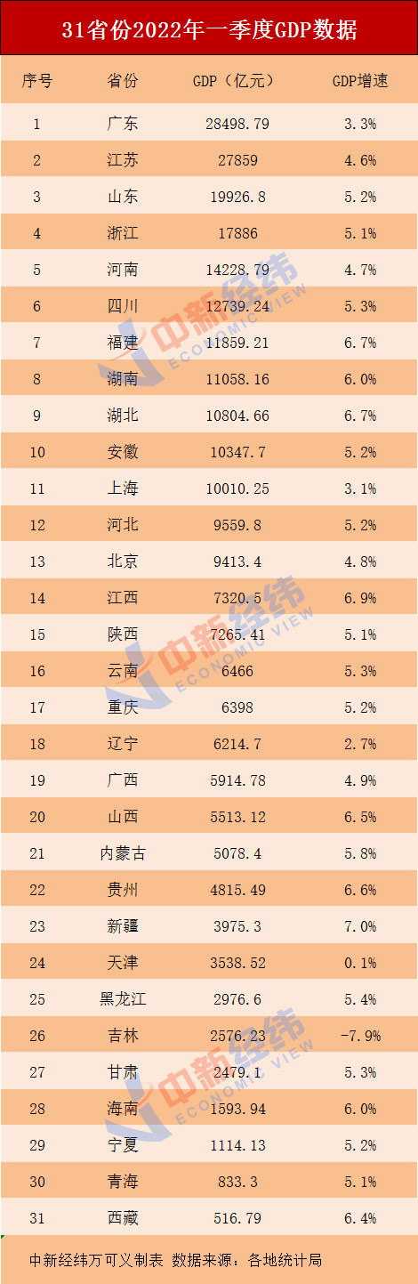 2.隨著西藏于5月1日發布2022年一季度經濟運行情況,31省份一季度GDP數據已全部出爐?偭糠矫,粵蘇魯穩居前三;增速方面,23省份高于“全國線”,新疆表現最佳,增速達到7.0%。