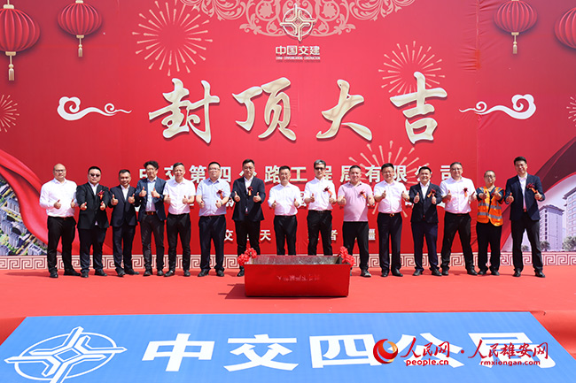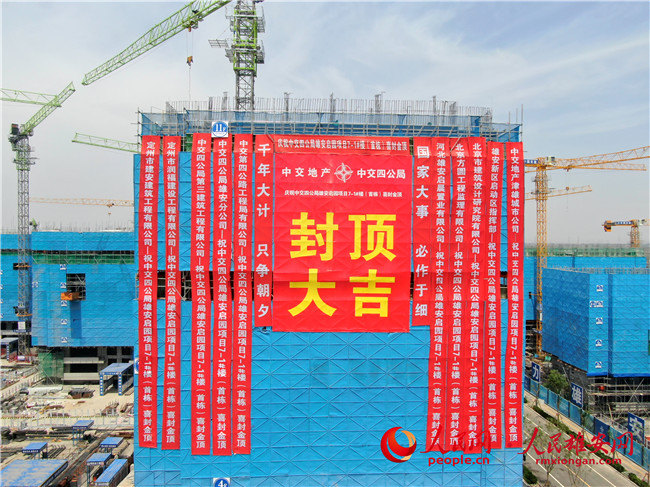 圖為雄安新區啟動區西北部居住片區XAQD-0023地塊項目二標段首棟樓封頂現場。中交四公局供圖