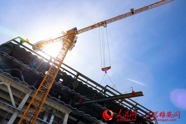 雄安自貿試驗區綜合管理服務中心項目最后一根鋼梁正在吊裝。人民網 宋燁文攝