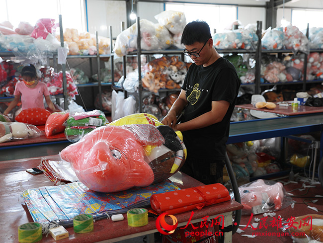 圖為商家正在封裝毛絨玩具。人民網 王紅攝