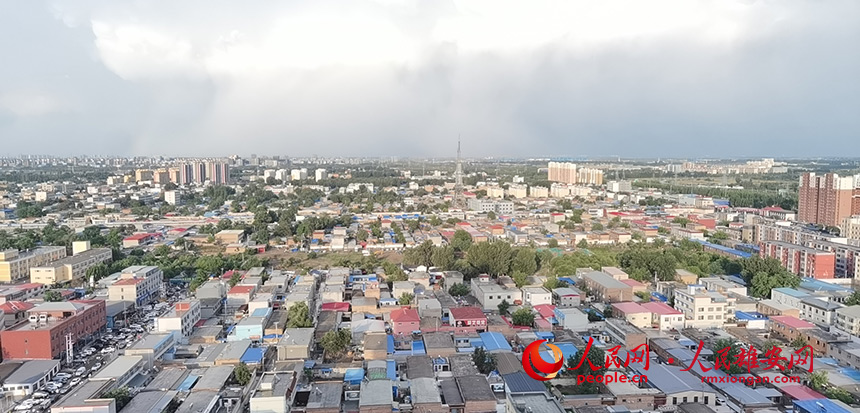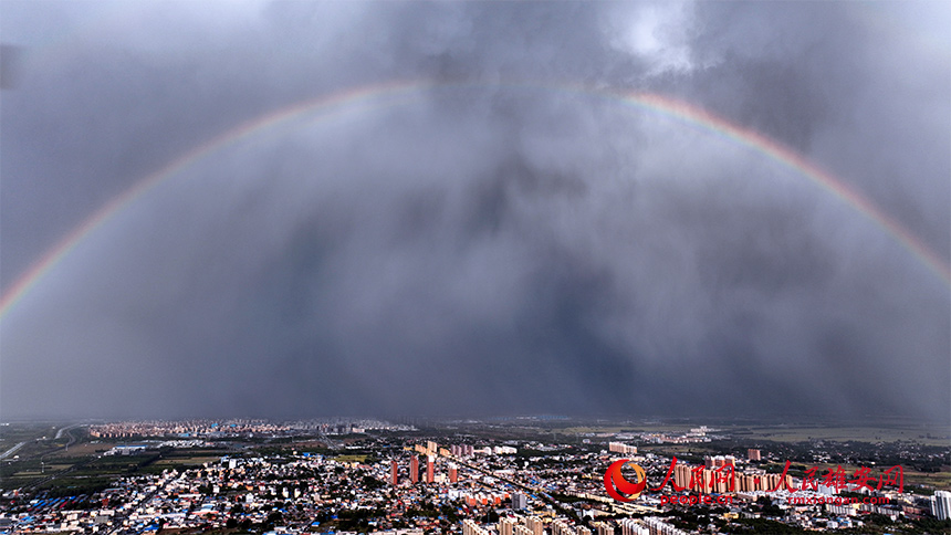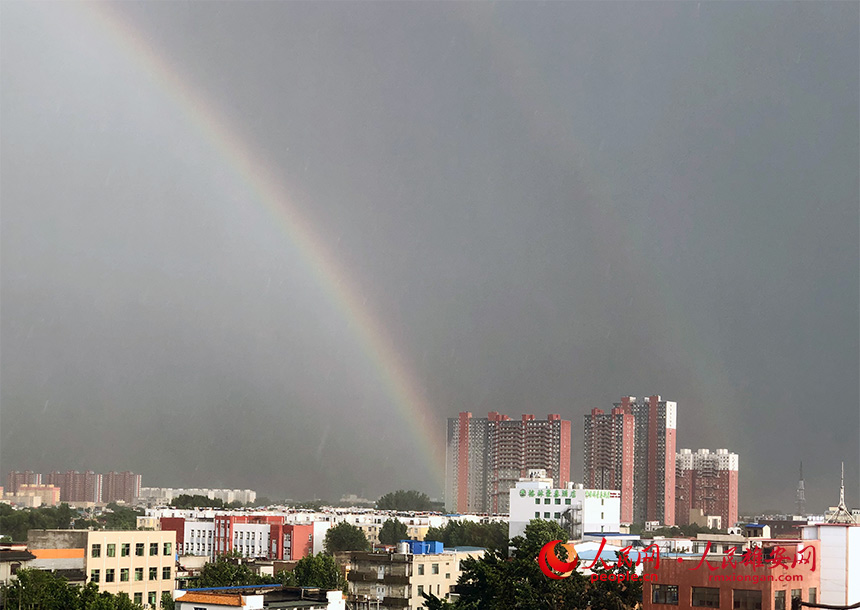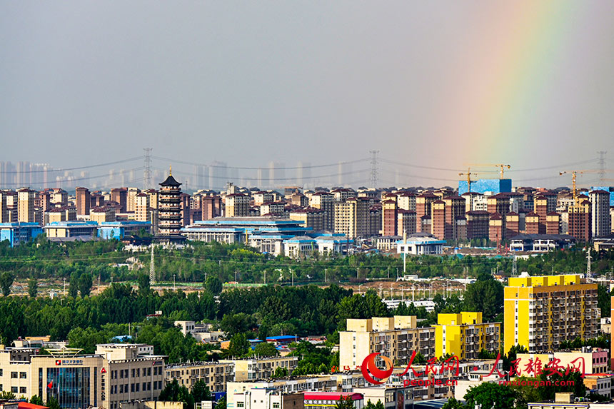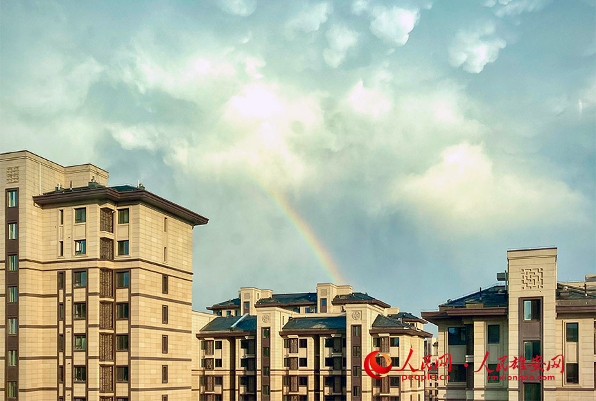 雄安容東安置區上空,彩虹沖破云層。人民網 宋燁文攝
